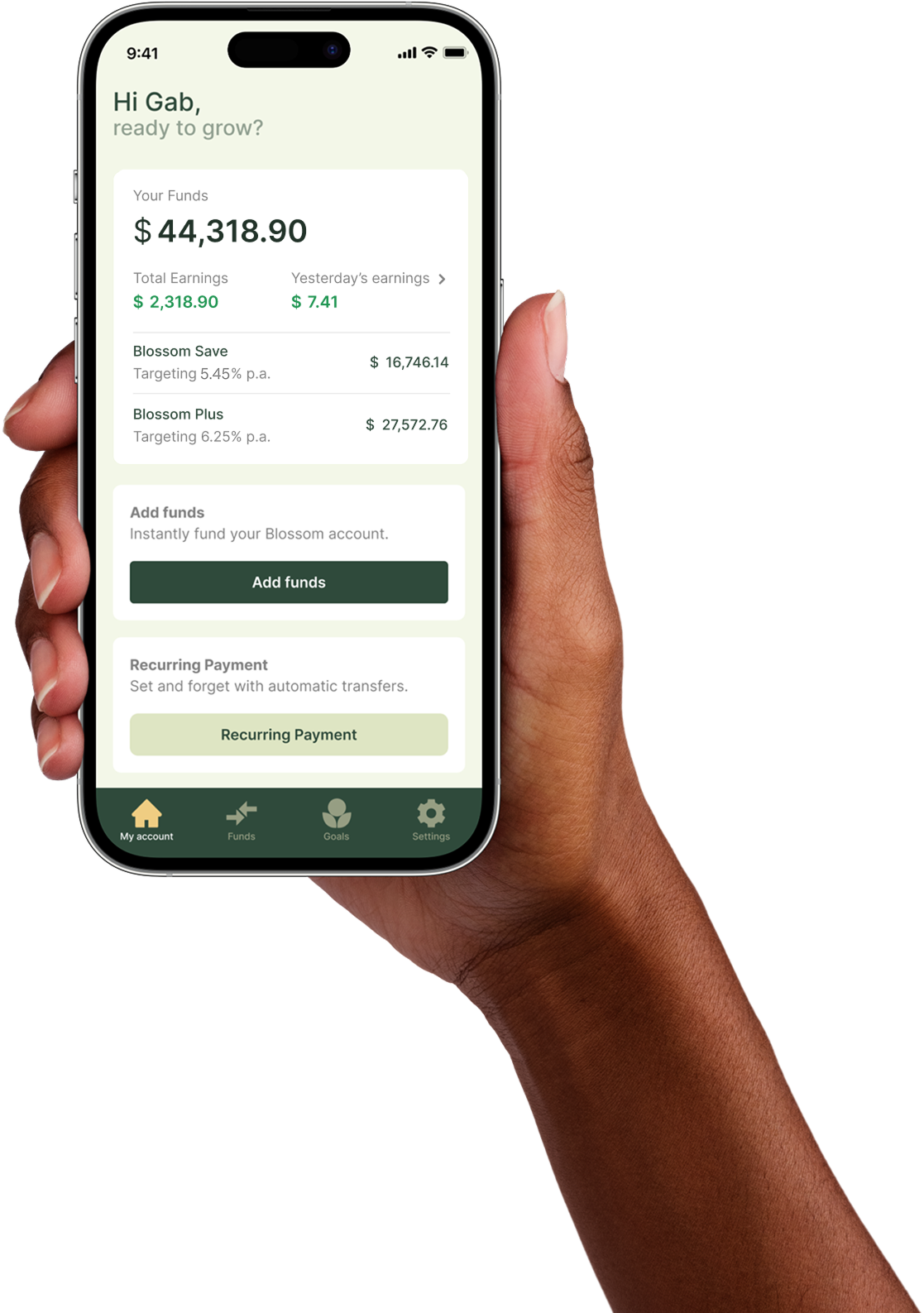 Blossom Plus helps you achieve your long-term financial goals, faster by targeting 6.25% p.a. returns on your savings. Earnings are posted daily and compounded quarterly! Start investing with $5,000 and enjoy no account, sign-up, transfer or withdrawal fees.